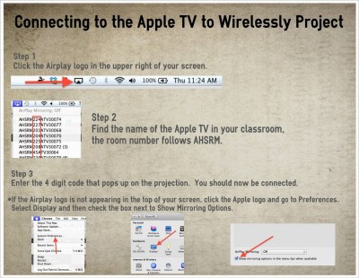 Connecting a Macbook Air to an Apple TV wirelessly is fairly easy and can be set up so that any computer can connect in order to share what is on their computer. I suggest setting up your Apple TV so that you have it for a passcode instead of a password. The passcode allows only the person who can see the screen to connect, meaning that a student can not try to connect to it while they are in another room. And always remember that you can use the menu button on the remote to kick a person off of the Apple TV if they start sharing something inappropriate or out of bounds.