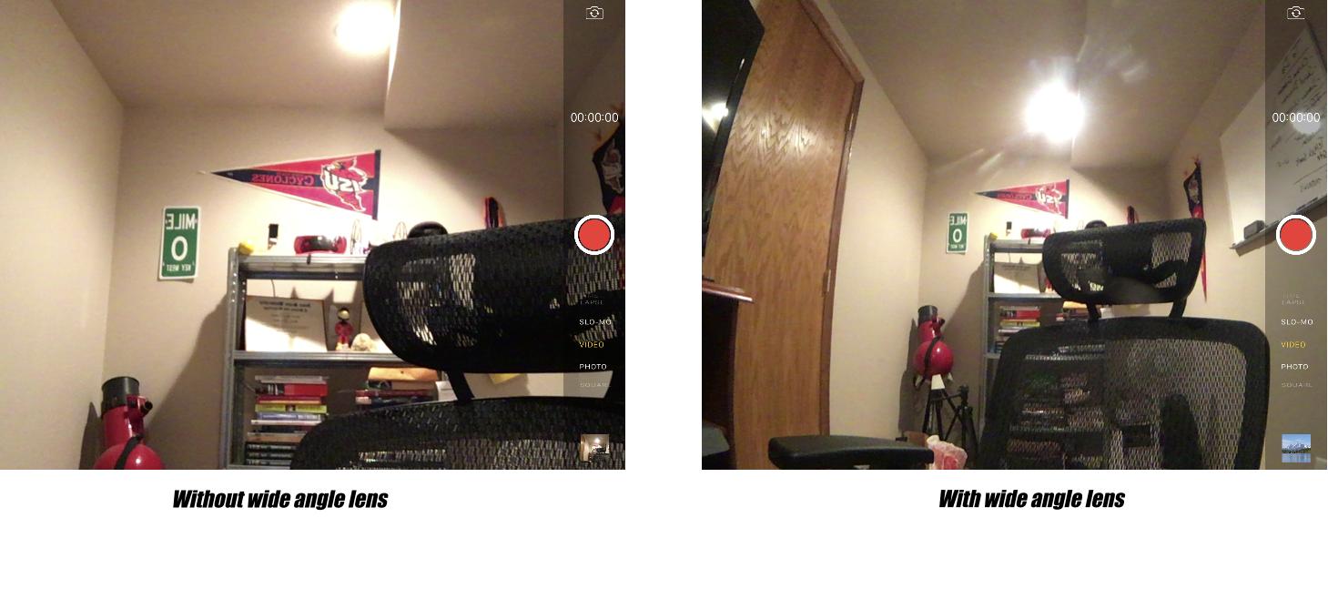 This case should make it much easier to record and should mean you have more options where you place the Swivl to record the classroom. In the pictures below, the left image is without the lens and the right images is with the lens. While this was just in my home office, you can see a much wider perspective which will translate to a very large difference when used in a classroom or meeting space.