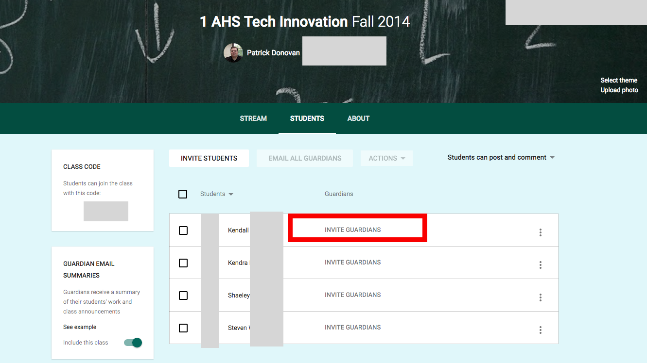 Teachers can enter the Parents/Guardians email address in the Student section of classroom where it says to “Invite Guardians”. You should easily see if their email address is already in because they signed up in another class. Even if the email address is in, you still have to Invite them. Parents/Guardians will need a Google account too.