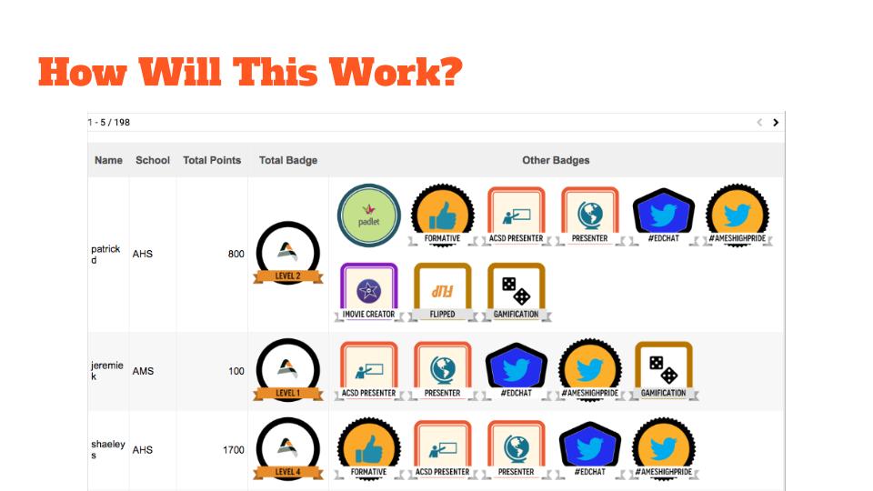 I am using an Awesome Table to display the total points and badges that teachers have earned. The forms, that they fill out to get their points, feed into a pivot table which will sum up their points for each category. That pivot table is brought into another sheet that has the headers for the Awesome Table. The key is the set of equations on that sheet that will pull in the correct badge for each teacher based on their score in each category. The badges had to be hosted on an external Google Site, not a school account Google Site, in order for them to show up.