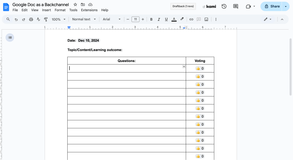 Now the tool I had used in the past is gone, which is why I always say “Date technology, do not marry it” because tech will come and go. There are some other options out there but you need to find one that just works for you and your students. My simplest way of doing this is just with a Google Doc. Create a Google Doc and insert a table with 2 columns: one for the question and one for the voting chip (Smart Chip). Insert the voting chips in the right column and then share them with your students so they have editing access. Now, you may have to have some conversations the first time you share a Doc with your whole class about appropriate usage, but those are good conversations to have and should not just be avoided. Students can enter their questions/comments during class, and then other students can upvote the questions that they have. This allows you to see the top questions from students so you can hit those questions first if time is short. This is a simple way to do this, and it just works. (If you are not a Google district, you should be able to do the same thing with a Word document, or you could even use a Figjam to do this.)