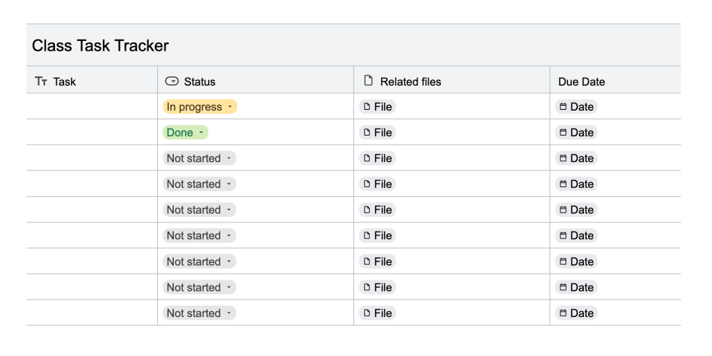 There is a simple way in Google Docs to use the Building Blocks feature and dropdowns to create a task tracker for students. Students could easily use this to write down all of the tasks they have to complete as they are assigned. These tasks can be the bigger assignments themselves or they could focus on the individual tasks needed to complete each big assignment, to help them better manage their workflows. If they were to work on a large project, having them identify each step they need to complete, write those down, and then track them, they would have more success than if they just saw that due date in Canvas. The goal is to identify the tasks that are needing to be completed and then tracking them. This document can create a nice visual for what they have to do but as they complete the tasks, help them to recognize the work they have done. Seeing all that you have already accomplished is one way to keep yourself motivated to keep attacking those tasks.