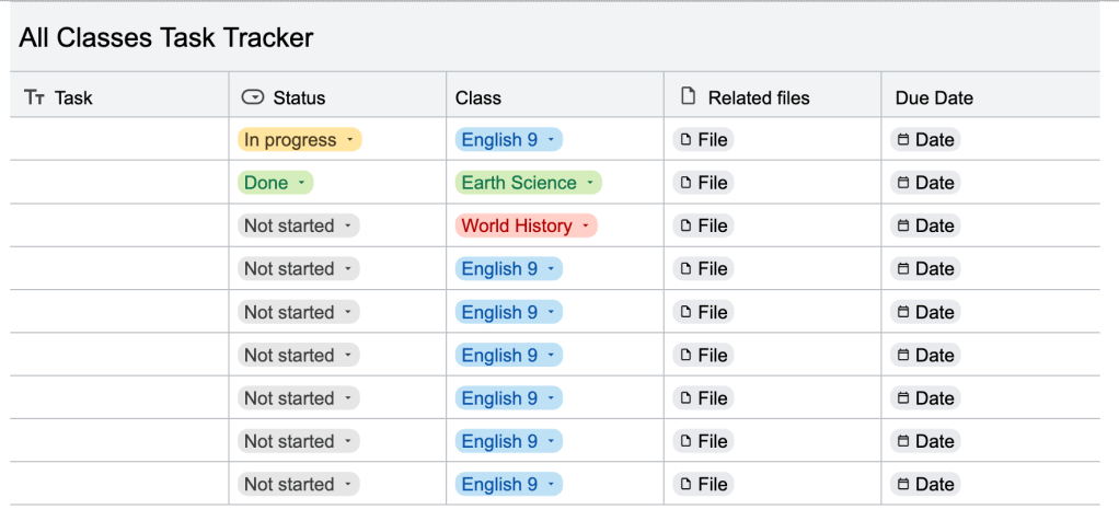 You could even modify this and add in a new column to indicate the different classes so students could have all of their tasks in one place. That might be too many tasks to see in one spot for some students, but some may need to see all the tasks in order to know how much they really need to do. If they only have a limited of time to complete these tasks, knowing the total number they have to tackle can help them figure out how to prioritize their time.